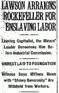 This is another little gem I found in Upton Sinclair’s anthology “The Cry for Justice.” John Lawson entered the mines as a pit boy when he was eight years old. By the time of the Ludlow Strike and Massacre (1913-1914), of which he writes, he was an organizer for the United Mine Workers. The unnamed philanthropist is, of course, John D. Rockefeller, Jr. To increase profits, his Colorado Fuel and Iron Company cut corners on safety: more than 1,700 miners died in Colorado from 1884 to 1912, a rate 2 to 3.5 times the national average. (A good summary of this era is in Howard Zinn’s A People’s History of the United States, pgs 346-349. The headline image is from the Jan 30 1915 New York Times, describing Lawson’s testimony before the Federal Commission on Industrial Affairs inquiry.) We would use this article during the Dorothy Day session of the Class of Nonviolence, where we typically discuss the difference between charity and justice. Think of some contemporary examples . . . companies that brag of their charitable giving while their employees lack health insurance . . .